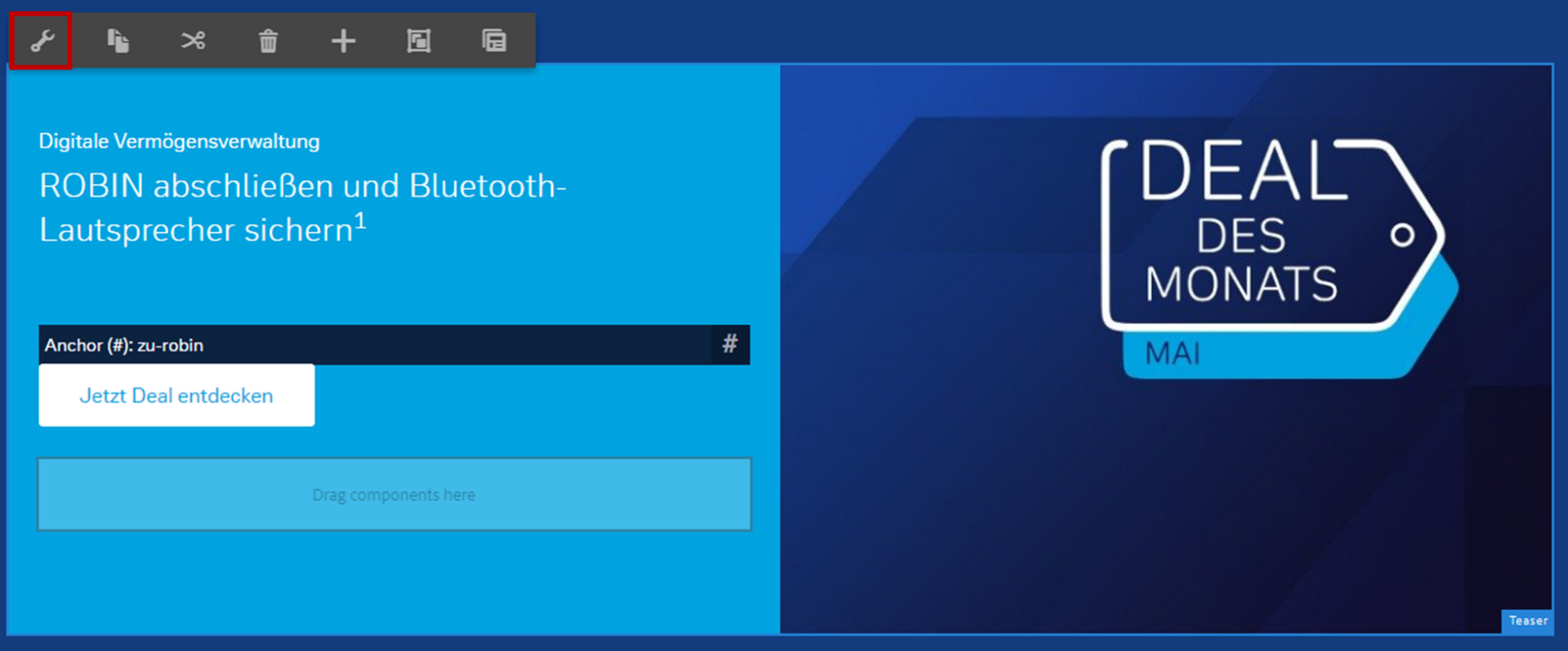 - Komponente auf der Seite in AEM auswählen (hier am Bsp. eines Teasers auf der Startseite):