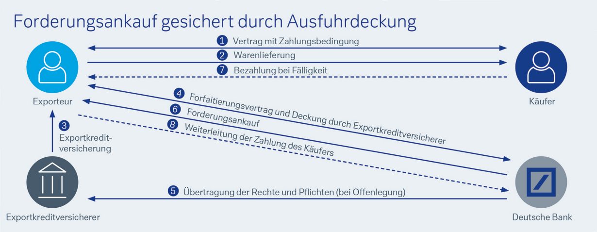 Die Kombination aus Exportkreditgarantie und Forderungsverkauf ist eine Möglichkeit, das Risiko von Zahlungsausfällen im internationalen Geschäft zu minimieren und die oft langen Zahlungsfristen zu überbrücken. Ein Kreditinstitut, der sogenannte Forfaiteur, kauft dabei eine mit einer Ausfuhrdeckung eines Exportkreditversicherers besicherte Forderung aus einem bestehenden Lieferantenkredit an. Forfaitierung funktioniert ähnlich wie Factoring. Allerdings sind bei der Forfaitierung die Summen signifikant höher, die Laufzeiten deutlich länger – bis zu sieben Jahre sind möglich. Zudem ist eine Forfaitierung ein sogenannter Spezieskauf; es werden ausschließlich konkrete Forderungen gekauft.