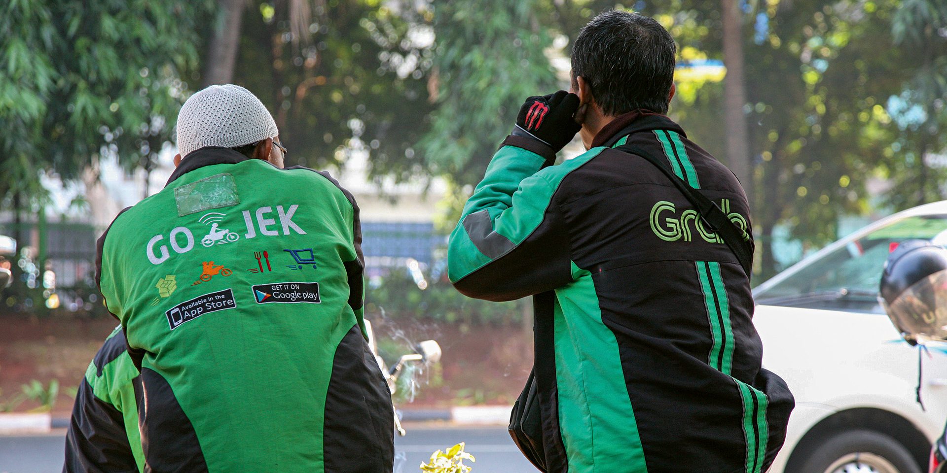 Fest in regionaler Hand: In Indonesiens Hauptstadt Jakarta kämpfen Grab (Malaysia/Singapur) und Gojek (Indonesien) um den Markt für Taxifahrten, Essenslieferungen und mehr. Der weltweite Marktführer Uber hat sich geschlagen geben müssen. Bildquelle: Pacific Press Media Production Corp. / Alamy Stock Photo
