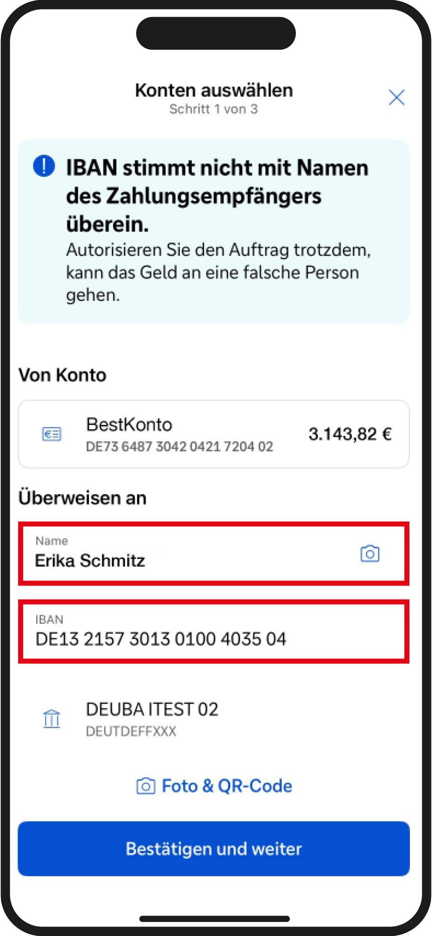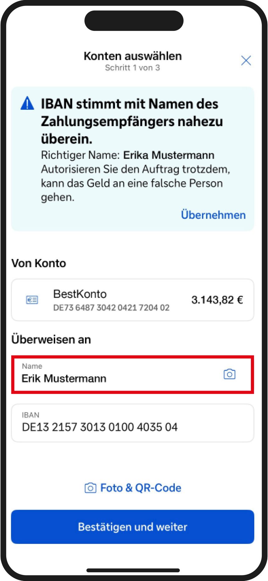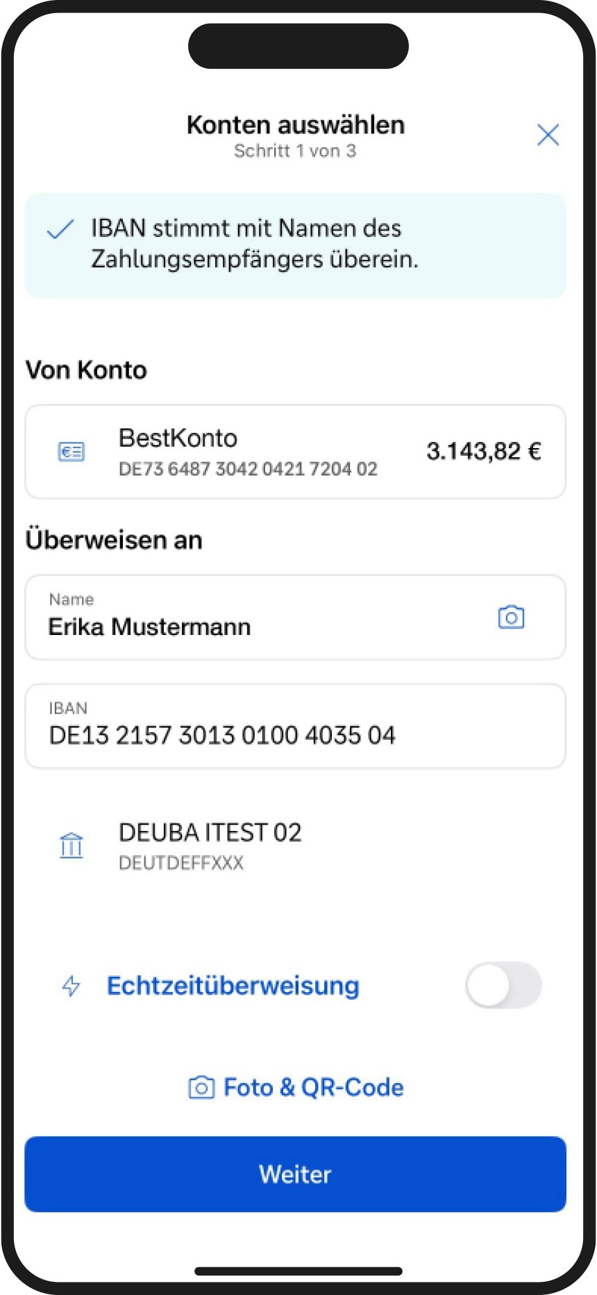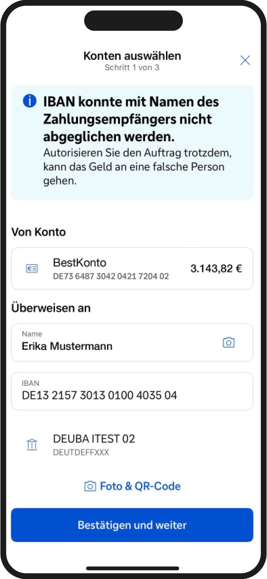 Die neue Verordnung verpflichtet Zahlungsdienstleister ab dem 9. Oktober 2025, vor der Ausführung einer SEPA-Überweisung oder einer SEPA-Echtzeitüberweisung eine Empfängerüberprüfung durchzuführen. Dabei werden die IBAN und der Name des Empfängers zur Überprüfung an die Empfängerbank weitergeleitet und abgeglichen. Nach Erhalt stellen wir Ihnen das Feedback innerhalb des Zahlungsvorgangs zur Verfügung und Sie entscheiden, ob Sie den Auftrag freigeben oder ablehnen möchten.