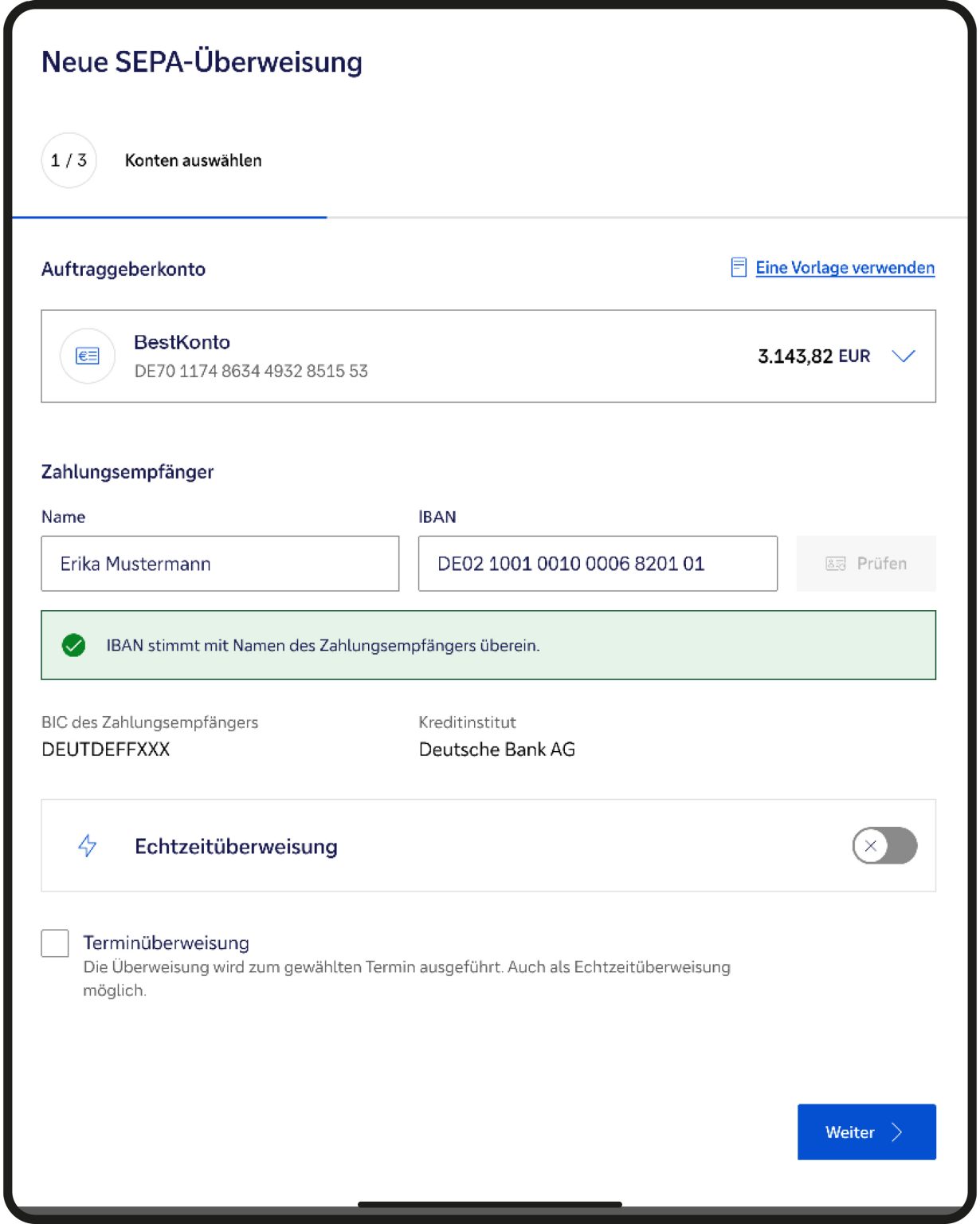 Im April 2024 wurde die "Instant Payments Regulation EU 2024/886" verabschiedet. Sie regelt, dass ab Oktober 2025 bei allen SEPA-Überweisungen eine neue, weitreichende Funktion für Kunden hinzukommt: die Empfängerüberprüfung. Das bedeutet, dass bei jeder SEPA-Überweisung überprüft wird, ob der von Ihnen angegebene Name zu dem Namen passt, der für die IBAN hinterlegt ist. So vermeiden Sie Fehlüberweisungen und sind noch besser vor Betrugsversuchen geschützt.