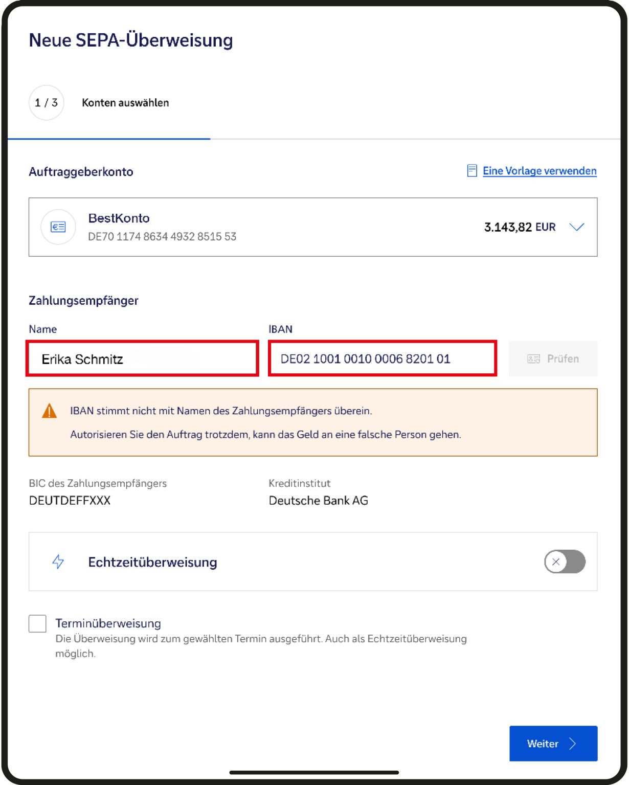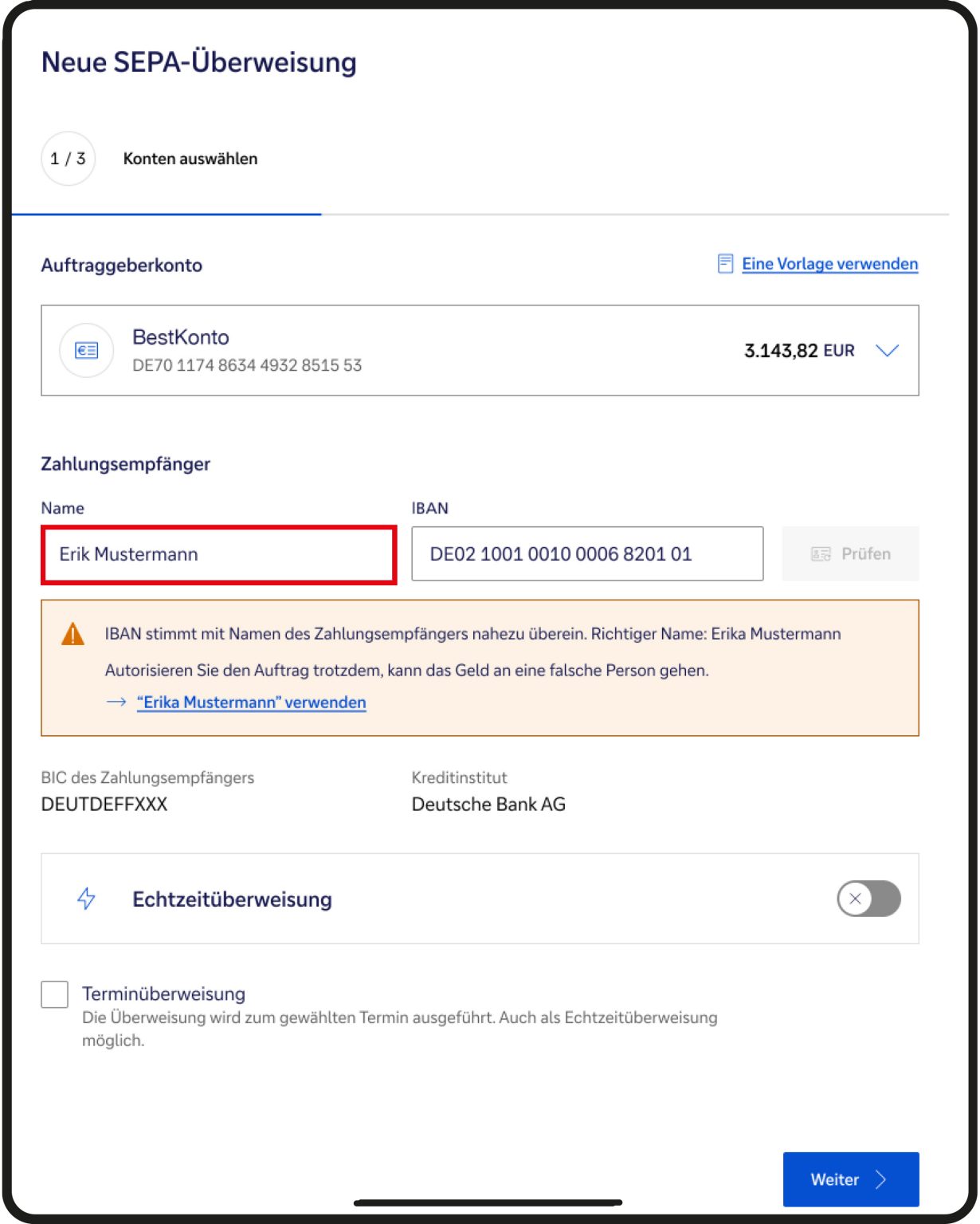 Im Zuge der Empfängerüberprüfung werden der Name und die IBAN des Empfängers abgeglichen. Dies soll betrügerische oder fehlgeleitete Zahlungen verhindern und den Schutz des Auftraggebers erhöhen.