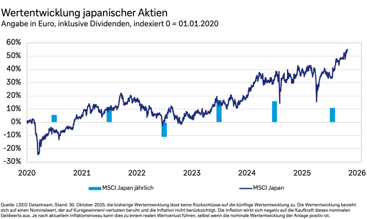 Auch die Bank of Japan (BoJ) hat den Leitzins unverändert gelassen. Gouverneur Ueda betonte, dass es keinen festen Zeitplan für Erhöhungen gibt. Daraufhin fiel der Yen auf ein Acht-Monats-Tief gegenüber dem US-Dollar und erreichte ein Rekordtief gegenüber dem Euro. Der japanische Aktienmarkt setzte seine Rally fort und notiert aktuell auf Rekordhöhen. Die Entscheidung wurde durch die Haltung der neuen Premierministerin Sanae Takaichi beeinflusst, die sich gegen Zinserhöhungen ausspricht und eine stärkere Zusammenarbeit zwischen Regierung und BoJ befürwortet – was den Yen schwach halten und die Exporte stützen könnte. Darüber hinaus plant Takaichi zusätzliche Ausgaben, Steuererleichterungen und Investitionen, die den Binnenmarkt ankurbeln sollen. Das Interesse globaler Investoren an Japan stieg aufgrund von „Takaichinomics“ deutlich. Zwischen den Wochen von Takaichis Wahl zur LDP-Vorsitzenden und zur Premierministerin haben ausländische Investoren rund 6,5 Billionen Yen (36 Milliarden Euro) in japanische Aktien investiert – der größte Zufluss innerhalb eines Vier-Wochen-Zeitraums seit mindestens 2005. Analysten zeigen sich optimistisch und haben ihre Gewinnprognosen für die im MSCI Japan gelisteten Unternehmen für das laufende und die beiden kommenden Geschäftsjahre um rund 0,5 Prozent nach oben korrigiert. Das erwartete Gewinnwachstum für 2026 und 2027 liegt nun bei 12,3 und 9,0 Prozent.