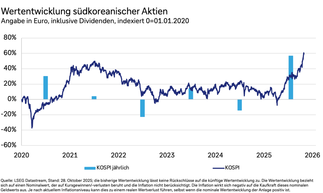 Südkoreas Wirtschaft wuchs im dritten Quartal 2025 mit 1,7 Prozent so stark wie seit über einem Jahr nicht mehr und übertraf damit die Prognose von 1,5 Prozent. Haupttreiber waren Exporte und Industrieproduktion, die um sechs beziehungsweise 3,3 Prozent gegenüber dem Vorjahr zunahmen. Der Bausektor hingegen schrumpfte um 8,1 Prozent und bremste das Gesamtergebnis. Laut der Bank of Korea stützt sich das Wachstum auf eine anhaltende Erholung des Konsums und günstige Exportbedingungen, insbesondere in der Halbleiterbranche. Die Notenbank erwartet für das Gesamtjahr 2025 ein Wachstum von 0,9 Prozent und von 1,6 Prozent für 2026. Die Zahlen erscheinen vor dem Hintergrund schwieriger Handelsverhandlungen zwischen Seoul und der Regierung Trump. Präsident Lee Jae-myung kritisierte die US‑Strategie als einseitig und warnte vor „katastrophalen Folgen“. Im Juli hatte Südkorea einem reduzierten US‑Tarif von 15 Prozent im Gegenzug für Investitionen von 350 Milliarden US‑Dollar zugestimmt. Ein weiteres Treffen Lees mit US-Präsident Donald Trump ist am Rande des APEC‑Gipfels in Gyeongju geplant. Nachdem der Kospi-Index der Börse Seoul seit Jahresbeginn in Euro gerechnet knapp 60 Prozent zugelegt hatte, legte er gestern eine Verschnaufpause ein. Dennoch könnte Korea mit einem Kurs-Gewinn-Verhältnis von 11,8 und Gewinnerwartungen von 25,5 Prozent langfristig einen Blick wert sein.
