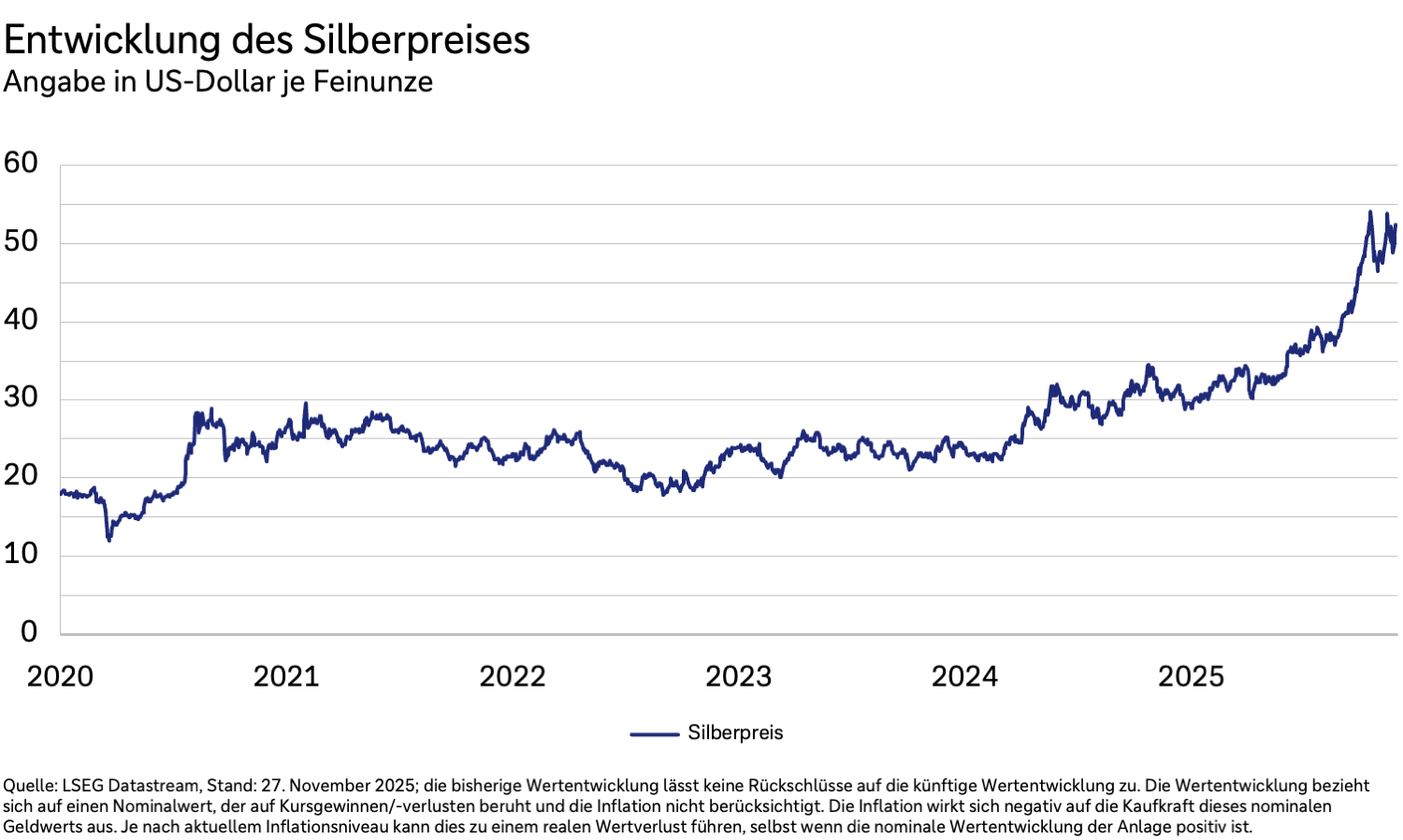 Silber hat Anlegern beeindruckende Renditen beschert: Von Oktober 2023 bis November 2025 stieg der Preis um 163 Prozent auf fast 55 US-Dollar je Feinunze.