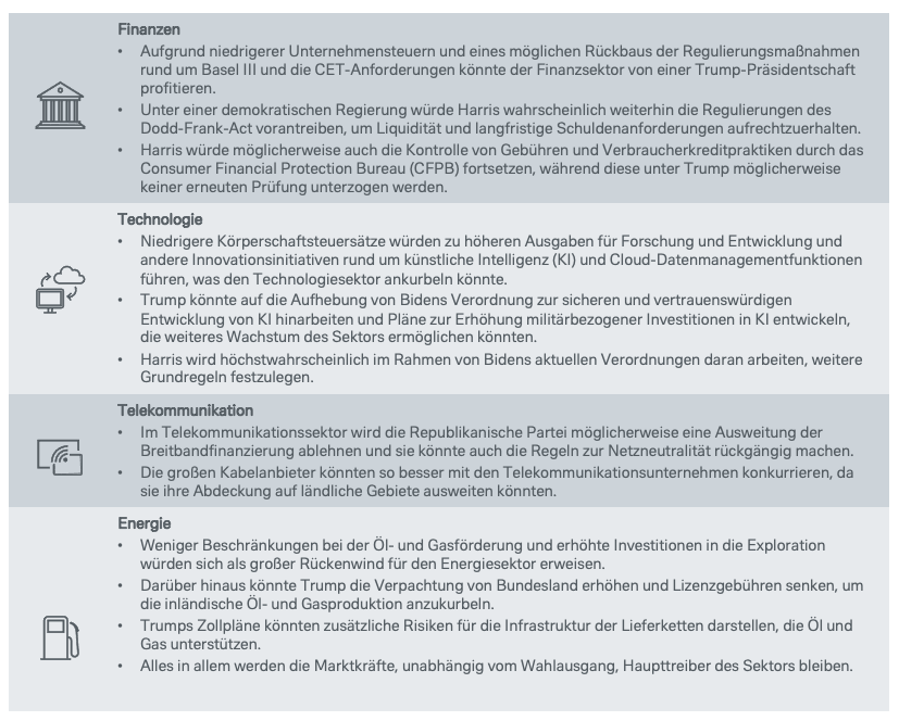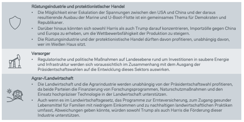 Die Entwicklung wichtiger Branchen wie Gesundheitswesen, Landwirtschaft, Verteidigung und Versorgungswirtschaft ist von dem Wahlergebnis eher unabhängig, auch wenn es aufgrund der starken Regulierung dieser Branchen zu kurzfristigen Schwankungen kommen kann.