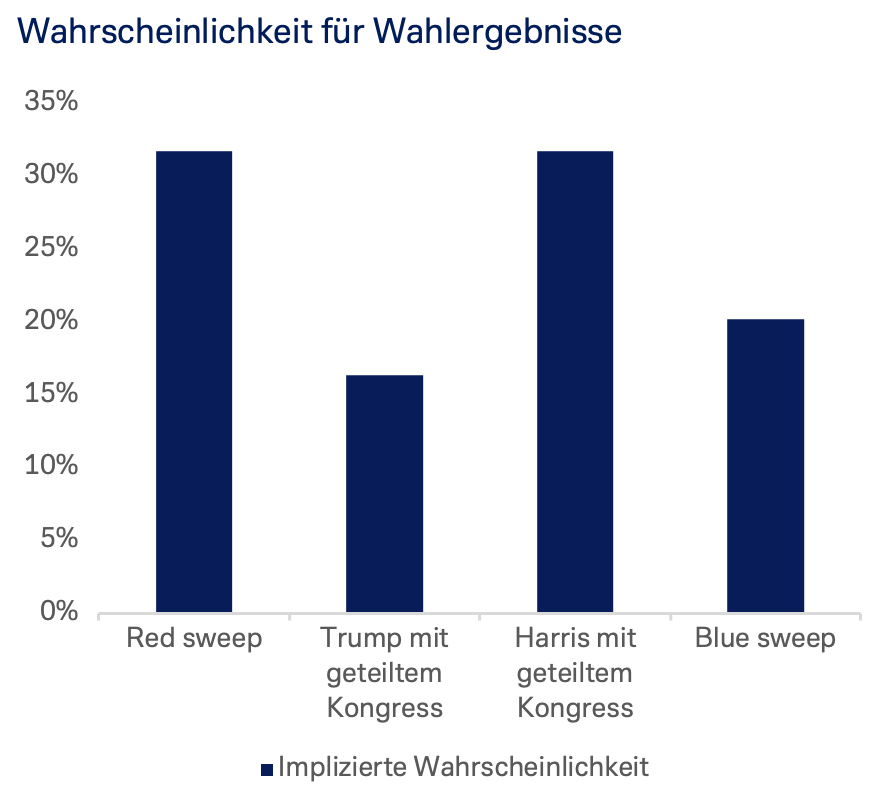 Aktuell erscheint als Wahlausgang eine „geteilte Regierung“ möglich, bei der die Präsidentin oder der Präsident nicht derselben Partei angehört, die die Mehrheit in einem oder beiden Häusern des Kongresses (Senat und Repräsentantenhaus) stellt, deren Mitglieder teilweise ebenfalls zur Wahl stehen. Im Rennen um die Präsidentschaft werden die Chancen von Trump und Harris mit 50:50 bewertet.