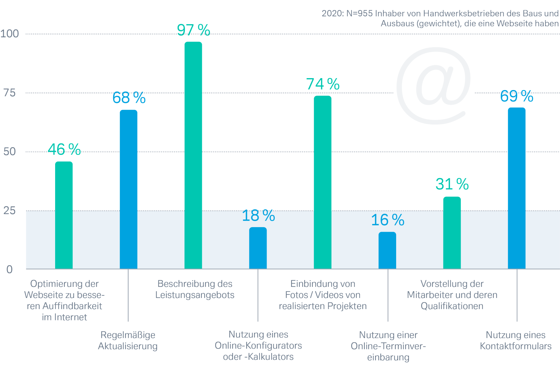 Damit gewinnt die aussagekräftige und aktuelle Website für Handwerksbetriebe weiter an Bedeutung. Vier von fünf Betrieben haben eine eigene Homepage. Dort stellen sie ihr Leistungsspektrum vor, zeigen Referenzprojekte und sind über ein Kontaktformular direkt ansprechbar.