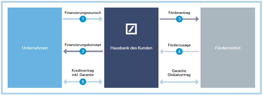 Im Rahmen der ganzheitlichen Unternehmensfinanzierung sind öffentliche Fördermittel ein wichtiger Baustein, um Unternehmen bei der Erreichung ihrer ökonomischen Ziele zu unterstützen. In nahezu jedes Vorhaben können öffentliche Förderungen einbezogen werden. Dabei können Anträge für öffentliche Förderdarlehen grundsätzlich nur über eine Hausbank, wie die Deutsche Bank, bei einem Förderinstitut gestellt werden. Sobald der Finanzierungswunsch des Kunden feststeht, unterstützt die Hausbank bei der Auswahl der passenden Finanzierungsmöglichkeiten und prüft außerdem die wirtschaftliche Tragfähigkeit des Vorhabens. Danach werden die Förderanträge vorbereitet, wobei die Hausbank dem Kunden auch bei der Erstellung der geforderten Unterlagen zur Seite steht. Diese werden anschließend mit dem Förderantrag an das Förderinstitut weitergeleitet und dort auf entsprechende Fördervoraussetzungen geprüft.