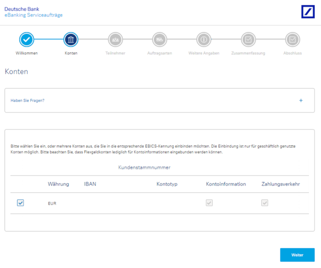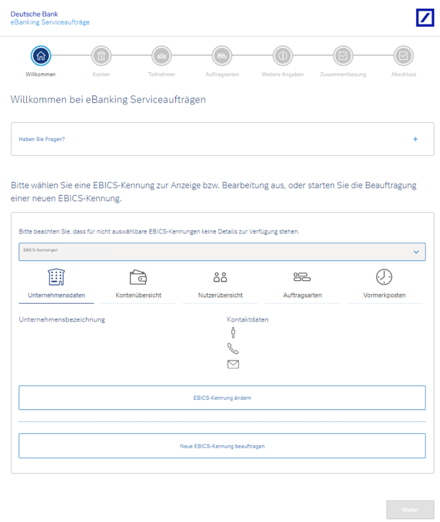Wenn Sie bereits registriert sind, können Sie unter dem folgenden Link neue EBICS-Kennungen beauftragen und Änderungsaufträge übermitteln: