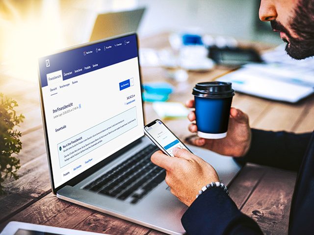 Nach dem Login mit Ihrer Deutsche Bank ID sehen Sie in der Finanzübersicht alle Produkte, wie z.B. Girokonto, Depot, Kredit oder Anlagen. Auch Konten, für die Sie vertretungsberechtigt sind, werden Ihnen angezeigt. - Mehr Online-Services